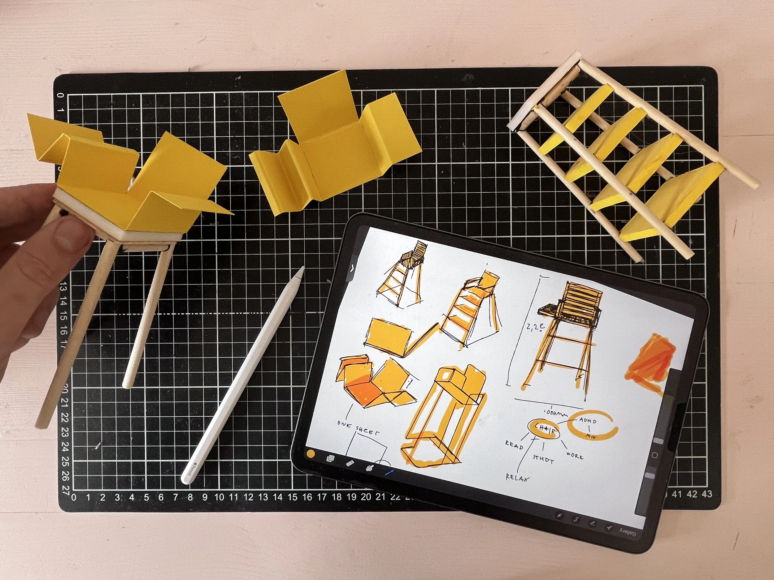 I created this chair with the aim of providing a secure place where the user can have an overlook of the environment, feeling as they have control over the situation. By adding the sheets with puncholes to the steps, I can use the empty space underneath the chair as a storage and display surface.