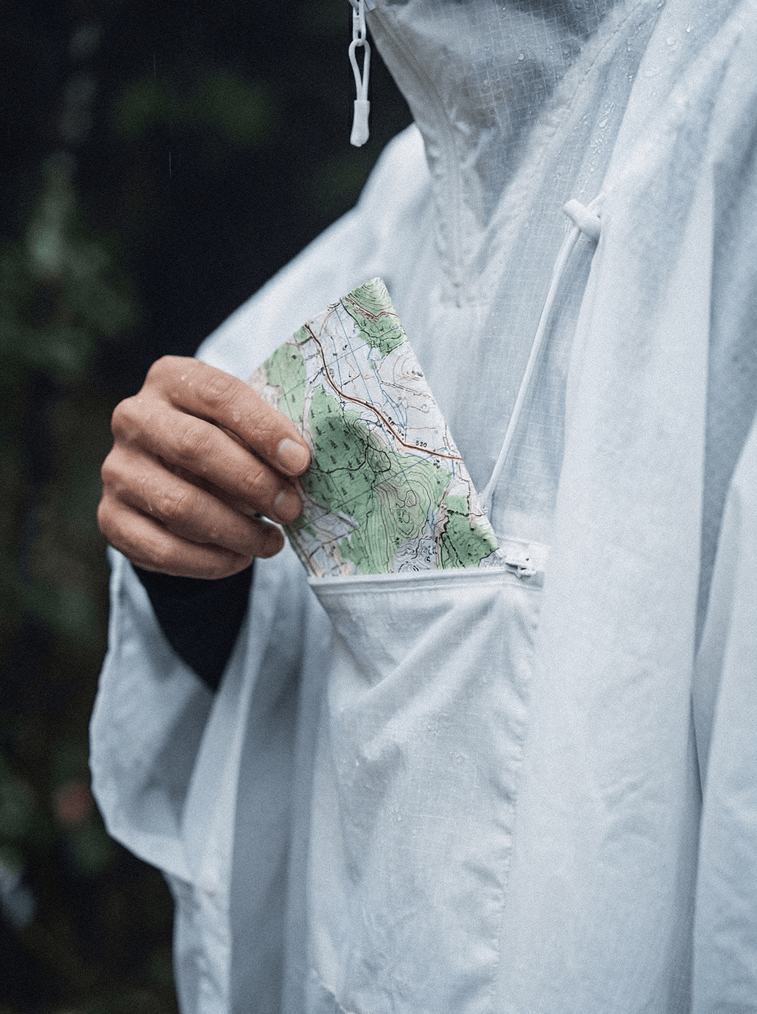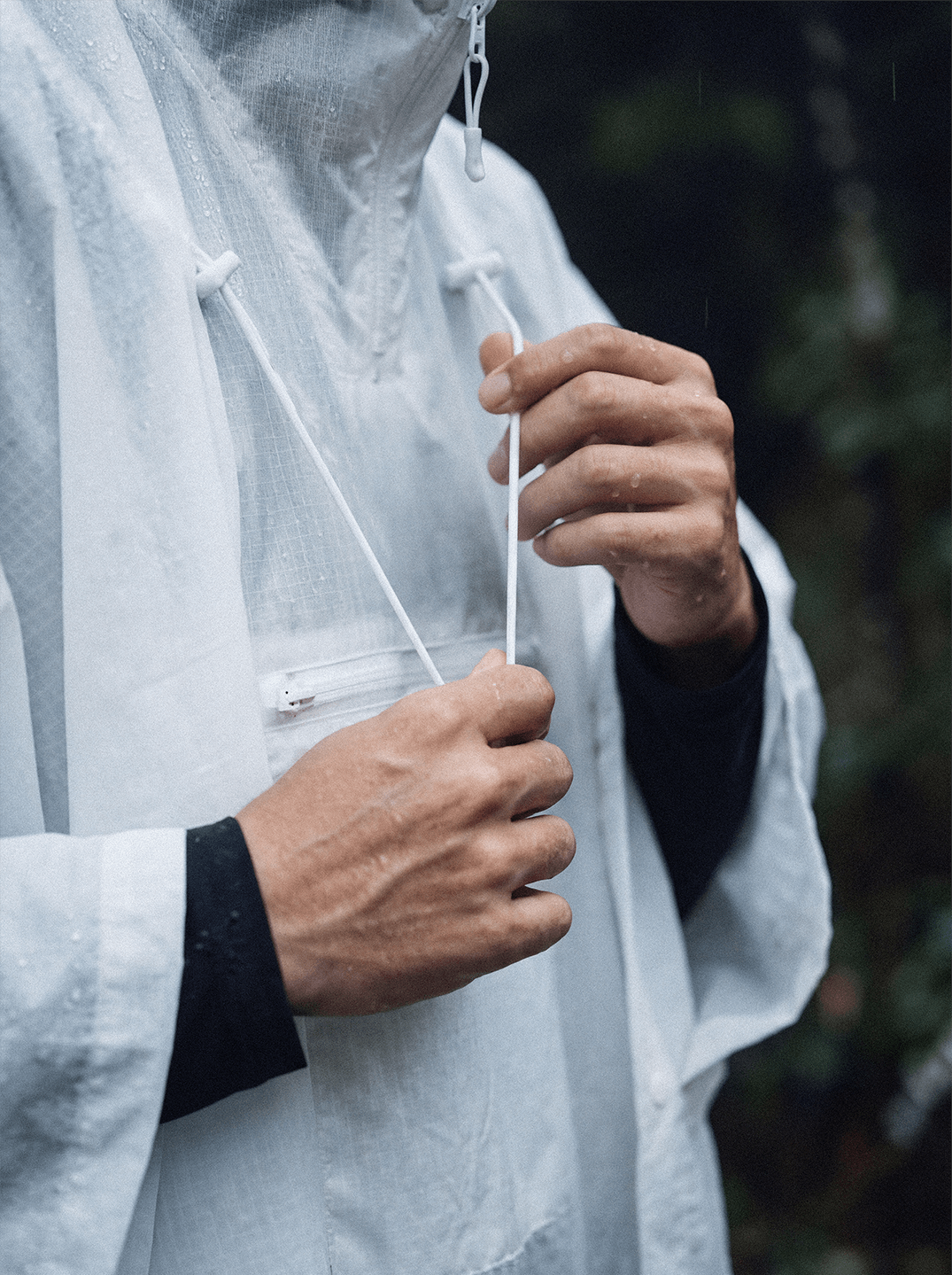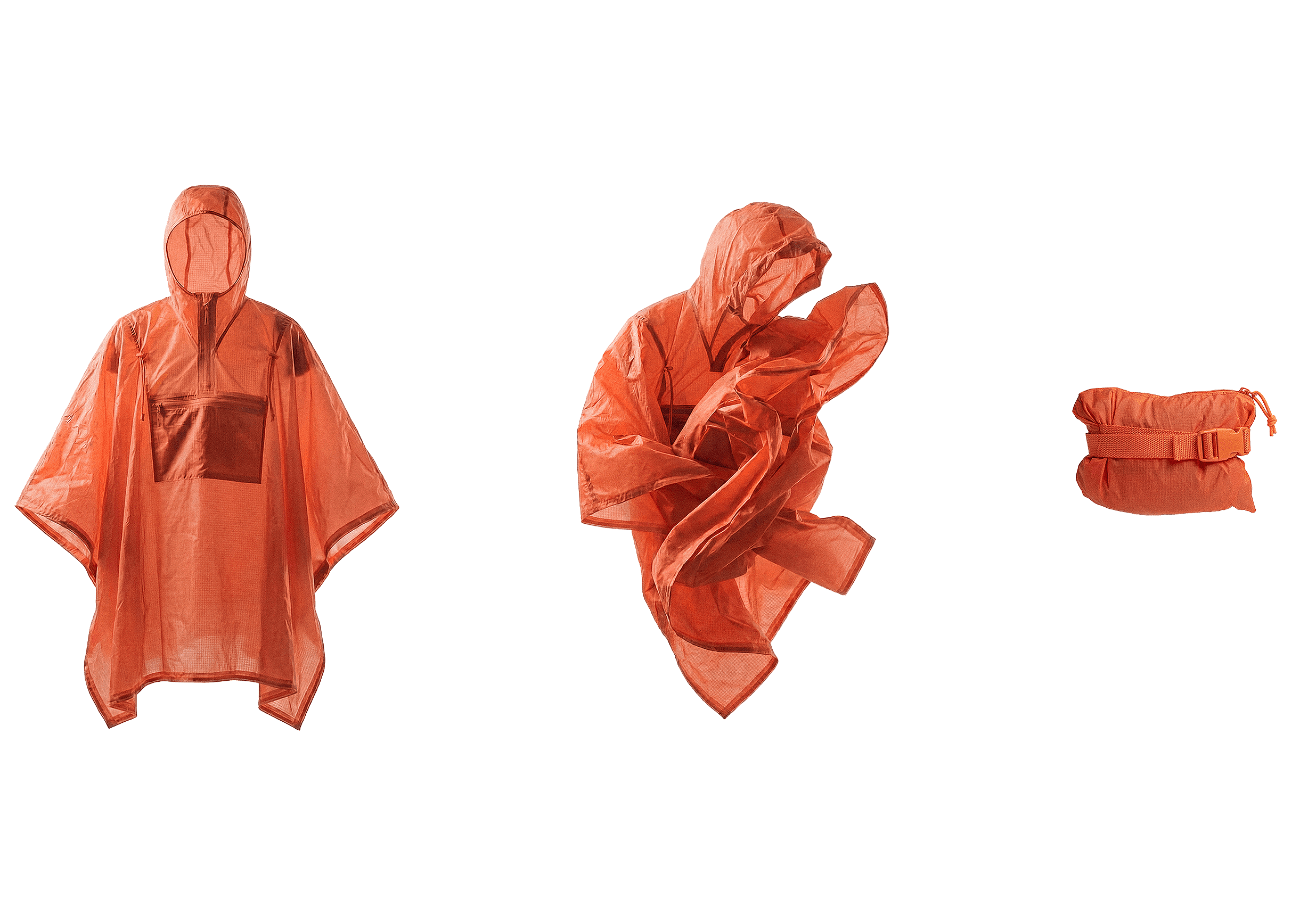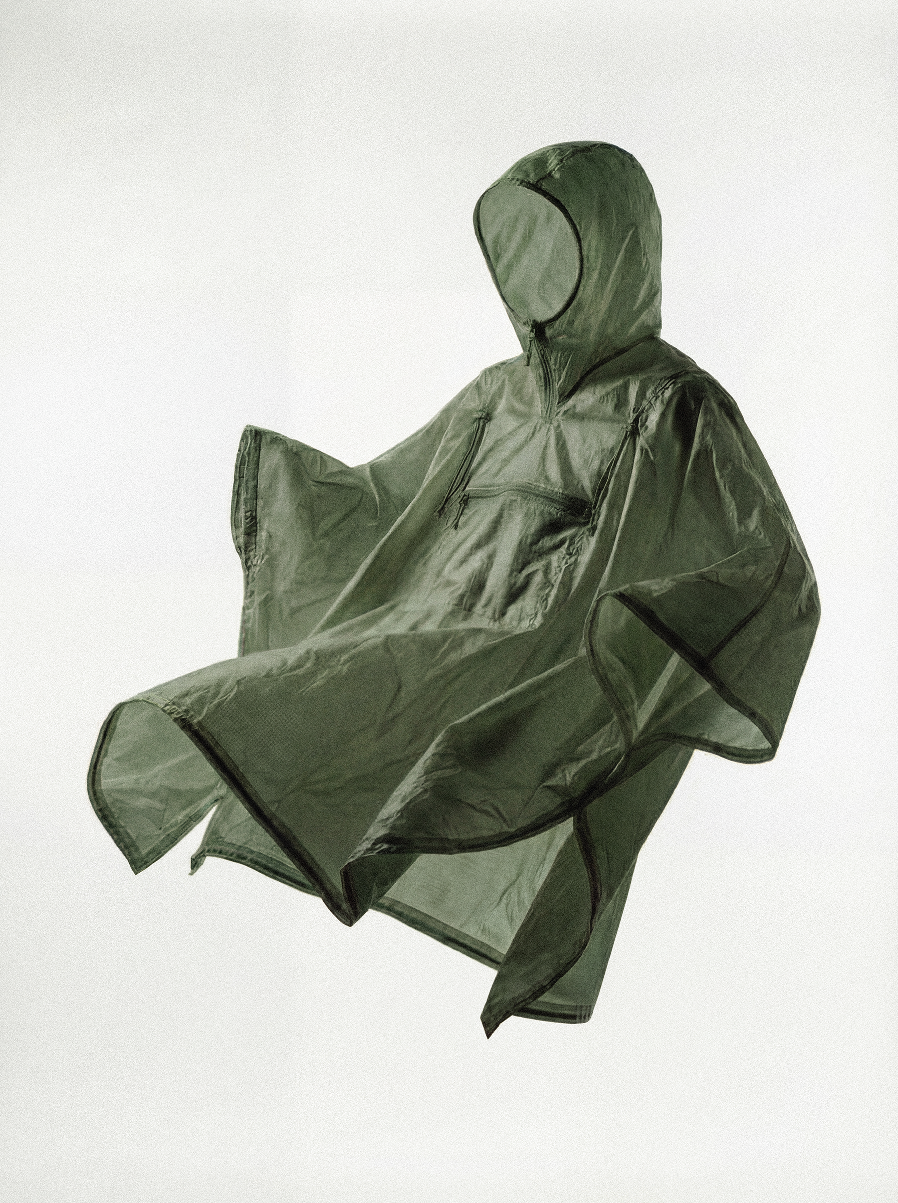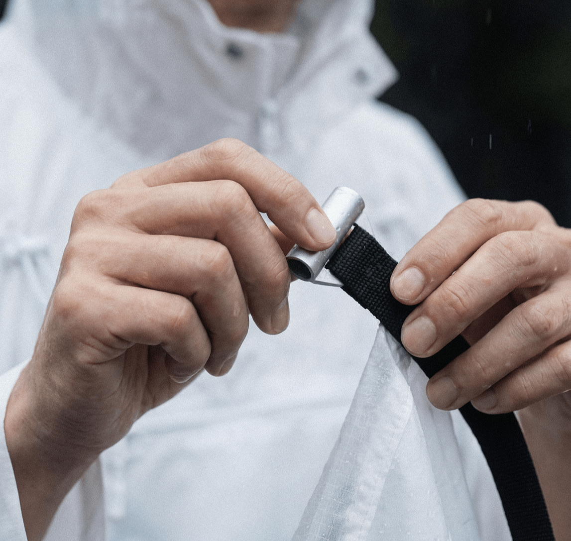 All the straps and accessories needed for the hammock are stored in hidden channels running along both short ends of the poncho. This enables everything to be carried in one piece, without the need for an extra pouch or the possibility of forgetting a strap or even losing it out in nature.
